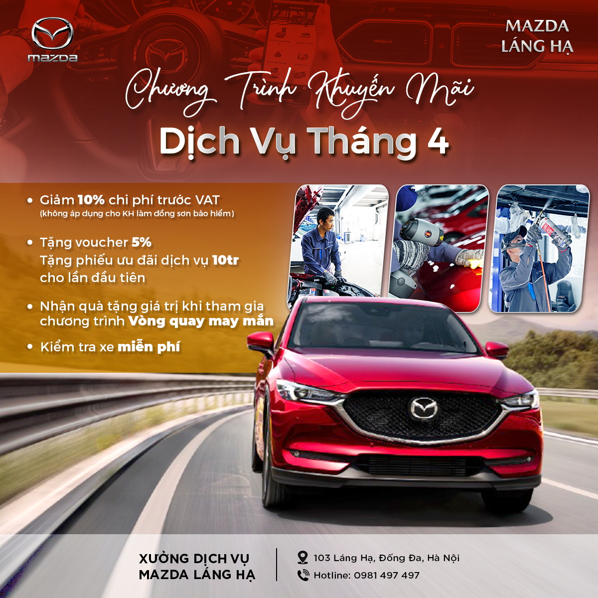- TẶNG phiếu ưu đãi dịch vụ 10Tr cho khách hàng lần đầu tiên sử dụng dịch vụ tại Mazda Láng Hạ / Mazda Nguyễn Trãi